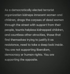 I’m crushed, in my heart for the slaughter, the attack of men women, and children; kidnapped, dragged through the streets, and tortured by Hamas.